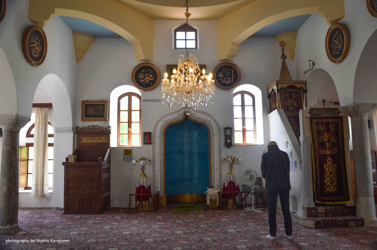 Σύμφωνα με το photographybysophiakaragianni.blogspot.gr, δύο κιονοστήρικτες κλίμακες, μία στην ανατολική και μία στην δυτική πλευρά, οδηγούν στο τέμενος, που βρίσκεται στον όροφο. Το ιερό και ο χώρος προσευχής των πιστών βρίσκεται στον δεύτερο όροφο, στον οποίο οδηγούν δυο περίτεχνες σειρές σκαλοπατιών στηριγμένες σε κίονες. Στη δυτική πλευρά ανοίγεται η κόγχη του μιχράμπ.