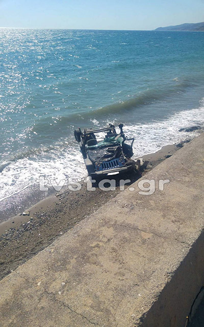 Μάλιστα, πληροφορίες αναφέρουν ότι το τζιπ έκανε τούμπα στον αέρα και έπεσε, από ύψος περίπου πέντε μέτρων στην ακτή της θάλασσας, με το πίσω μέρος.