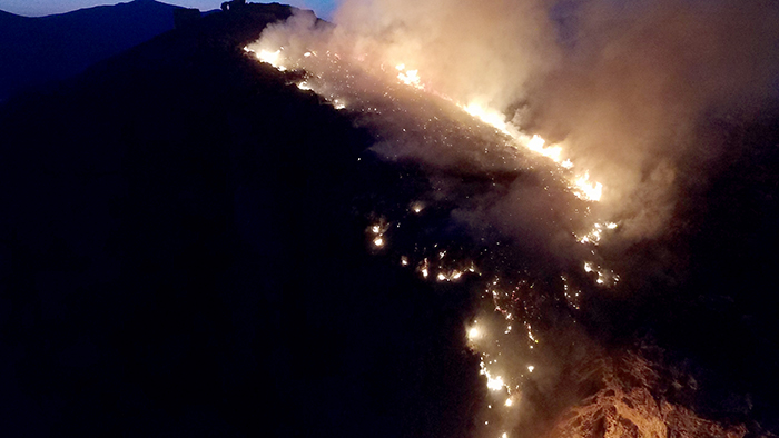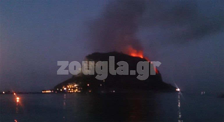 Μεγάλη φωτιά πάνω από το κάστρο της Μονεμβασιάς σε πολύ δύσβατο σημείο (εικόνες)