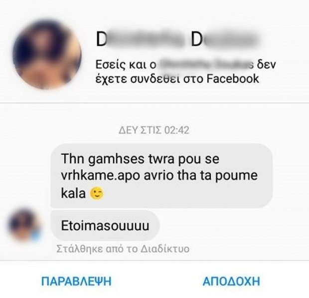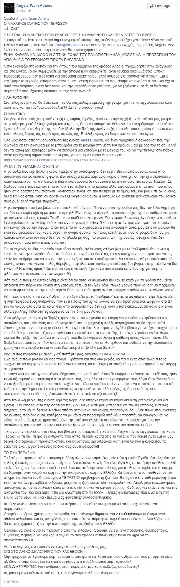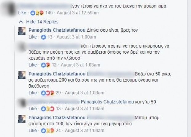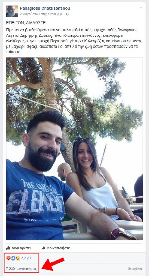 Παρόλα αυτά, ο «Panagiotis Chatzistefanou» δεν δίστασε να καλέσει τον διαδικτυακό «όχλο» σε «πογκρόμ» κατά του «μαχαιροβγάλτη» Δ.Δ με φωτογραφία του 27χρονου Φίλιππου Τσιπλάκου και της κοπέλας του.