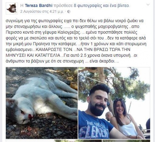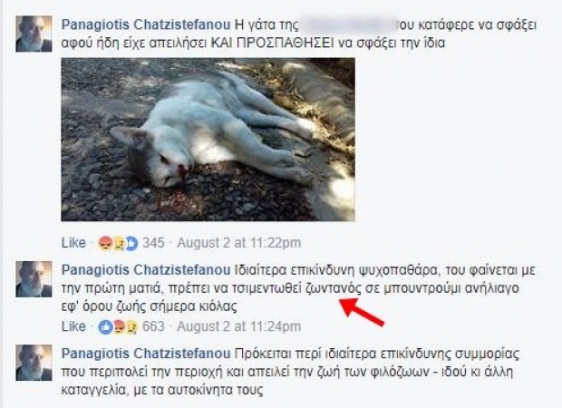 Στις 2 Αυγούστου, μια χρήστης του facebook ανέβασε στο λογαριασμό της, το παρακάτω πoστ, όπου αναφέρει περιστατικό πως ο εικονιζόμενος προσπάθησε να την σκοτώσει επειδή φροντίζει τις αδέσποτες γάτες. Μάλιστα κατάφερε, σύμφωνα με την ίδια, να «σκοτώσει» μια από τις αδέσποτες γάτες που φρόντιζε. (δεν αναφέρει πώς, αν και αφήνει να εννοηθεί ότι την έσφαξε).