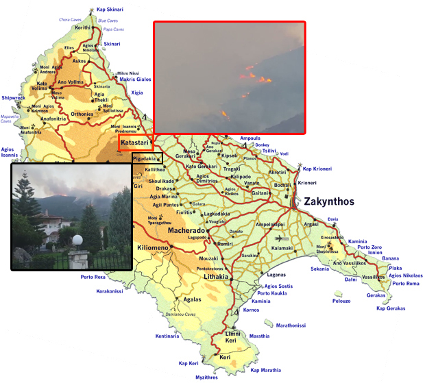 Το πύρινο μέτωπο μαίνεται λίγα χιλιόμετρα πάνω από τα χωριά Πηγαδάκια και Καλλιθέα και κάτω από τον οικισμό Καταστάρι. Στο σημείο βρίσκονται όλες οι πυροσβεστικές δυνάμεις του νησιού, ενώ νωρίς το απόγευμα έφτασαν στη Ζάκυνθο για να συνδράμουν στο έργο της κατάσβεσης, 30 πυροσβέστες με 4 οχήματα από την Πάτρα και τον Πύργο. Μέχρι τη δύση του ηλίου, ρίψεις νερού έκαναν δύο πυροσβεστικά αεροσκάφη, τύπου Καναντέρ και 2 Πετζετέλ, καθώς και ένα ελικόπτερο. Η φωτιά έχει κάνει στάχτη πεύκα και ελιές.