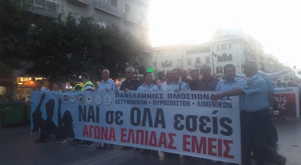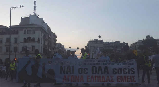 Η πορεία διαμαρτυρίας μελών των Πανελλήνιων Ομοσπονδιών Αστυνομικών, Πυροσβεστών και Λιμενικών πραγματοποιήθηκε παρουσία του αρχηγού της ΕΛ.ΑΣ. Κωνσταντίνου Τσουβαλά. Οι συμμετέχοντες κρατούσαν μαύρα μπαλόνια στα χέρια και διαδήλωναν κατά των περικοπών και εν όψει της επίσκεψης του πρωθυπουργού στη Θεσσαλονίκη, το Σάββατο, όπου θα πραγματοποιήσει και τα εγκαίνια της Διεθνούς Έκθεσης. Είχαν προηγηθεί νωρίτερα το απόγευμα προ-συγκεντρώσεις από τις Ομοσπονδίες των Εργαζομένων στα Σώματα Ασφαλείας στο άγαλμα του Βενιζέλου.