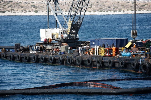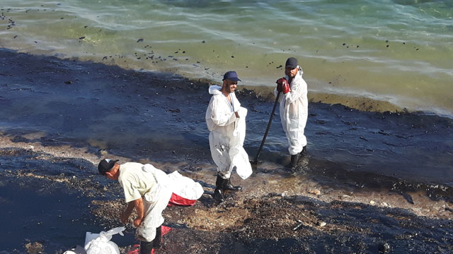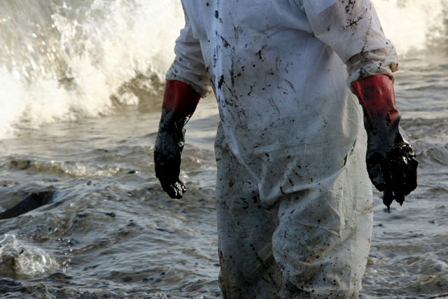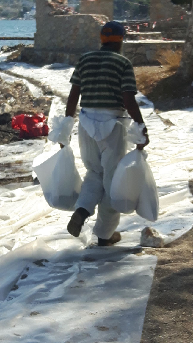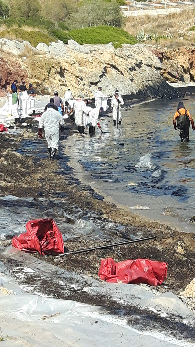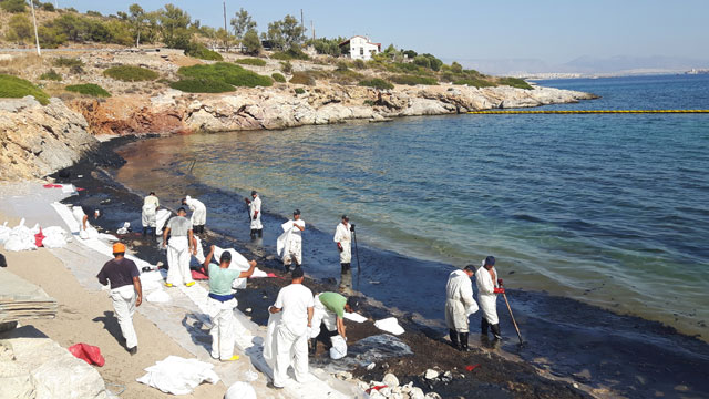 Πρόκειται για εργαζόμενους από 5 διαφορετικές εταιρείες απορρύπανσης, οι οποίοι δίνουν, τις τελευταίες ημέρες, τη μάχη για τον καθαρισμό των ακτών. «Δουλεύουμε από το πρώτο φώς μέχρι το τελευταίο» λέει ο Κώστας που είναι στους επικεφαλής της ομάδας. Με λευκές στολές, καπέλα και μαντήλια στο κεφάλι αντιμετωπίσουν τον καυτό ήλιο, ενώ με τα φτυάρια «ψαρεύουν» το πετρέλαιο που έχει εγκλωβιστεί στα πορτοκαλί φράγματα. Το βάζουν στα λευκά σακιά τους (ειδικά σακιά για να αποκλειστεί το ενδεχόμενο διαρροής) και το κουβαλάνε στα φορτηγά, με τα οποία θα φτάσουν στις εγκαταστάσεις διαχείρισης επικίνδυνων αποβλήτων.