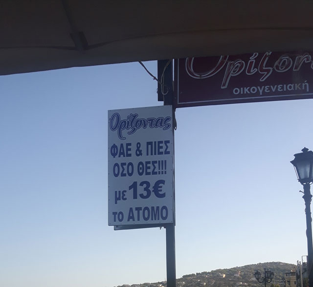 Μ΄ αυτά και μ΄ αυτά ο ήλιος άρχισε να πέφτει. Οι εργάτες της απορρύπανσης έφτασαν στο τέλος μιας ακόμη εξαντλητικής μέρας, ενώ στα καφενεία άρχισαν τα τσίπουρα. Αρκετός κόσμος μαζεμένος πλέον στους Ορίζοντες με την ταμπέλα «Φάε πιες όσο θες με 13 ευρώ».