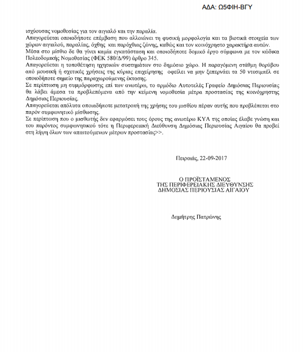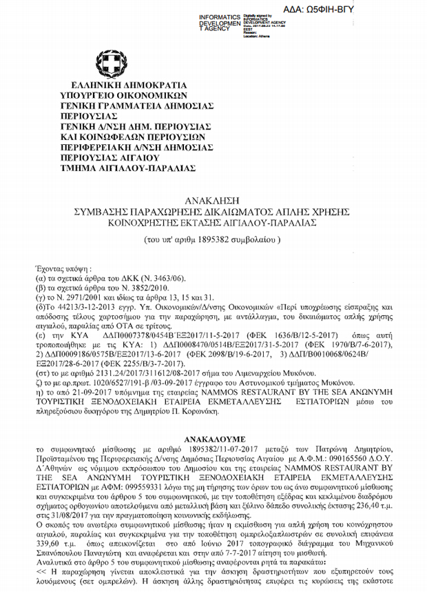 Συγκεκριμένα, ανακλήθηκε το από 11/7/2017 συμφωνητικό μίσθωσης μεταξύ της Περιφερειακής Διεύθυνσης Δημόσιας Περιουσίας Αιγαίου και της εταιρείας NAMMOS RESTAURANT BY THE SEA «λόγω της μη τήρησης των όρων» του συμφωνητικού μίσθωσης «με την τοποθέτηση εξέδρας και κεκλιμένου διαδρόμου σχήματος ορθογωνίου αποτελούμενα από μεταλλική βάση και ξύλινο δάπεδο συνολικής έκτασης 236,40 τμ στις 31/8/2017 για την πραγματοποίηση κοινωνικής εκδήλωσης».