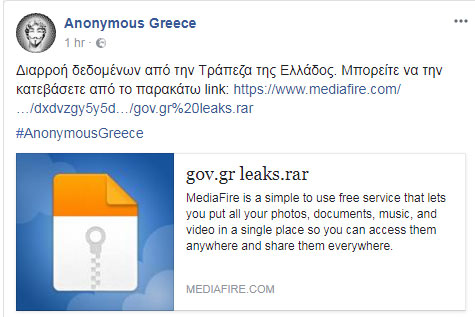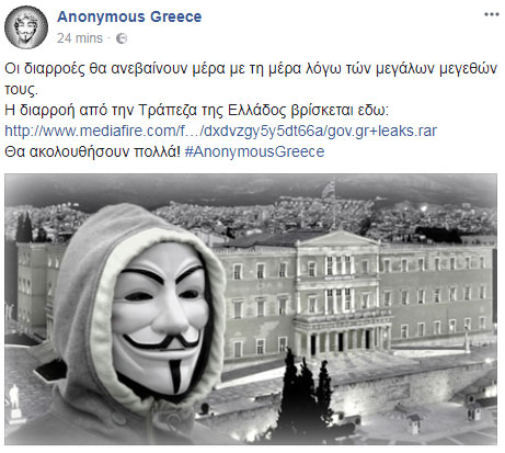 «Οι διαρροές θα ανεβαίνουν μέρα με τη μέρα λόγω των μεγάλων μεγεθών τους» γράφουν οι Anonymous Greece σχολιάζοντας τη διαρροή δεδομένων από την Τράπεζα της Ελλάδος, κάνοντας πράξη τη χθεσινή απειλή τους.