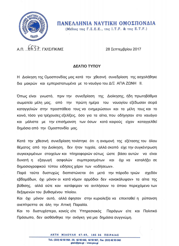 Σειρά ερωτημάτων για το ναυάγιο του δεξαμενόπλοιου ΑΓ. ΖΩΝΗ ΙΙ στον Σαρωνικό, θέτει με νέα της ανακοίνωση η Πανελλήνια Ναυτική Ομοσπονδία, τονίζοντας ότι μετά την πάροδο σχεδόν τριών εβδομάδων από τη βύθιση του πλοίου, όχι μόνον οι κατά νόμον αρμόδιοι δεν «ανακάλυψαν» τα αίτια της βύθισης, αλλά ούτε καν κατάφεραν να αντλήσουν το όποιο περιεχόμενο των δεξαμενών του.