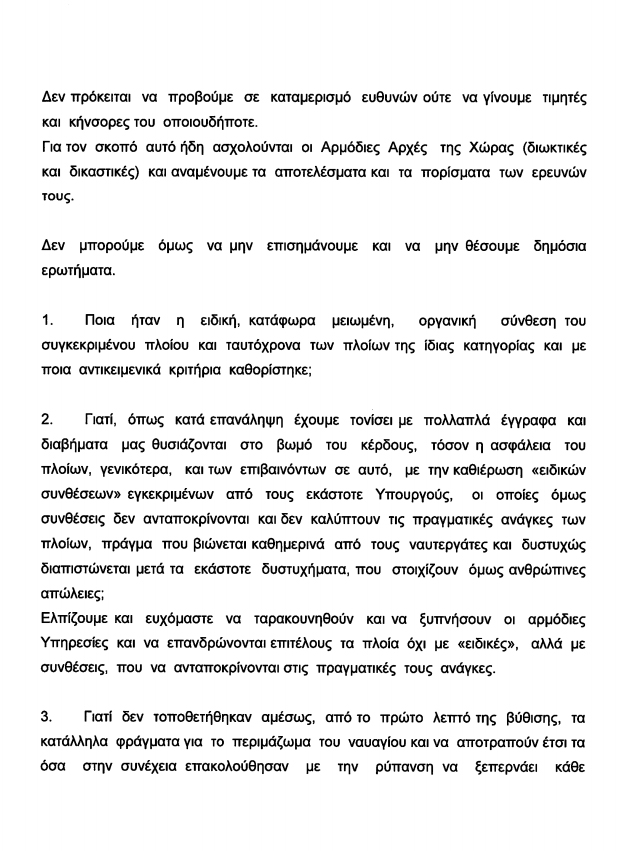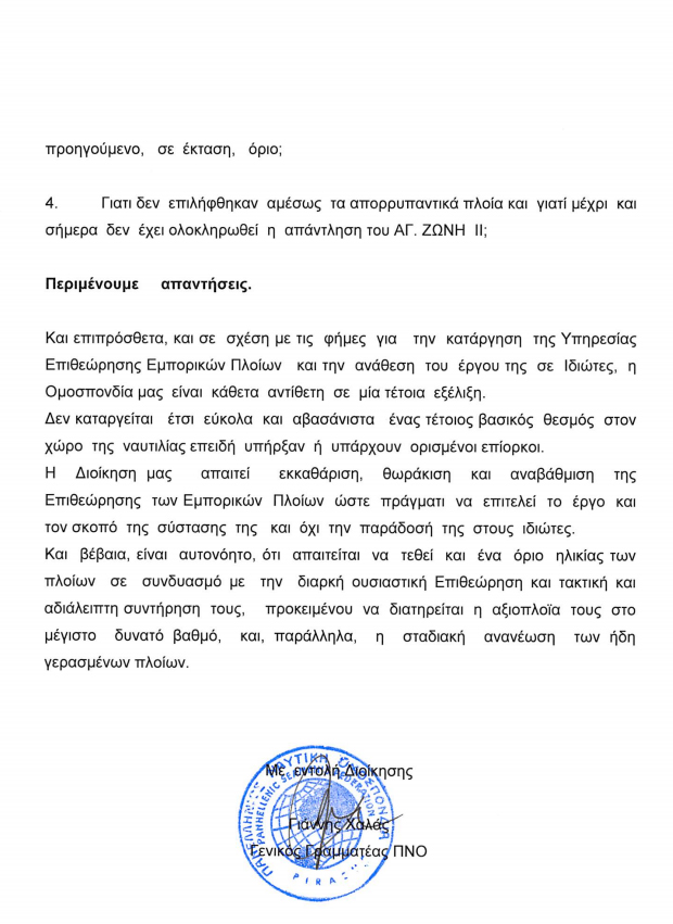 «Δεν καταργείται έτσι εύκολα και αβασάνιστα ένας τέτοιος βασικός θεσμός στον χώρο της ναυτιλίας, επειδή υπήρξαν ή υπάρχουν ορισμένοι επίορκοι. Η Διοίκησή μας απαιτεί εκκαθάριση, θωράκιση και αναβάθμιση της Επιθεώρησης των Εμπορικών Πλοίων» προσθέτει στην ανακοίνωση.