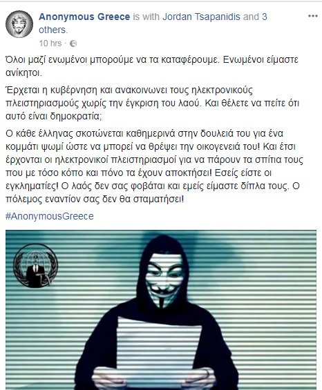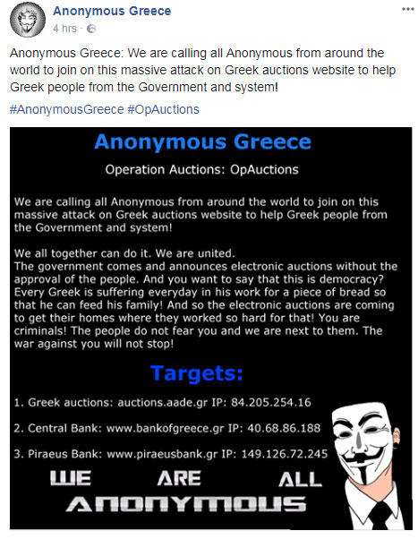 Νωρίτερα, είχαν γράψει στα ελληνικά απευθυνόμενοι στους Έλληνες χρήστες: «Όλοι μαζί ενωμένοι μπορούμε να τα καταφέρουμε. Ενωμένοι είμαστε ανίκητοι. Έρχεται η κυβέρνηση και ανακοινωνει τους ηλεκτρονικούς πλειστηριασμούς χωρίς την έγκριση του λαού. Και θέλετε να πείτε ότι αυτό είναι δημοκρατία; Ο κάθε Έλληνας σκοτώνεται καθημερινά στην δουλειά του για ένα κομμάτι ψωμί ώστε να μπορεί να θρέψει την οικογένειά του! Και έτσι έρχονται οι ηλεκτρονικοί πλειστηριασμοί για να πάρουν τα σπίτια τους που με τόσο κόπο και πόνο τα έχουν αποκτήσει! Εσείς είστε οι εγκληματίες! Ο λαός δεν σας φοβάται και εμείς είμαστε δίπλα τους. Ο πόλεμος εναντίον σας δεν θα σταματήσει!».
