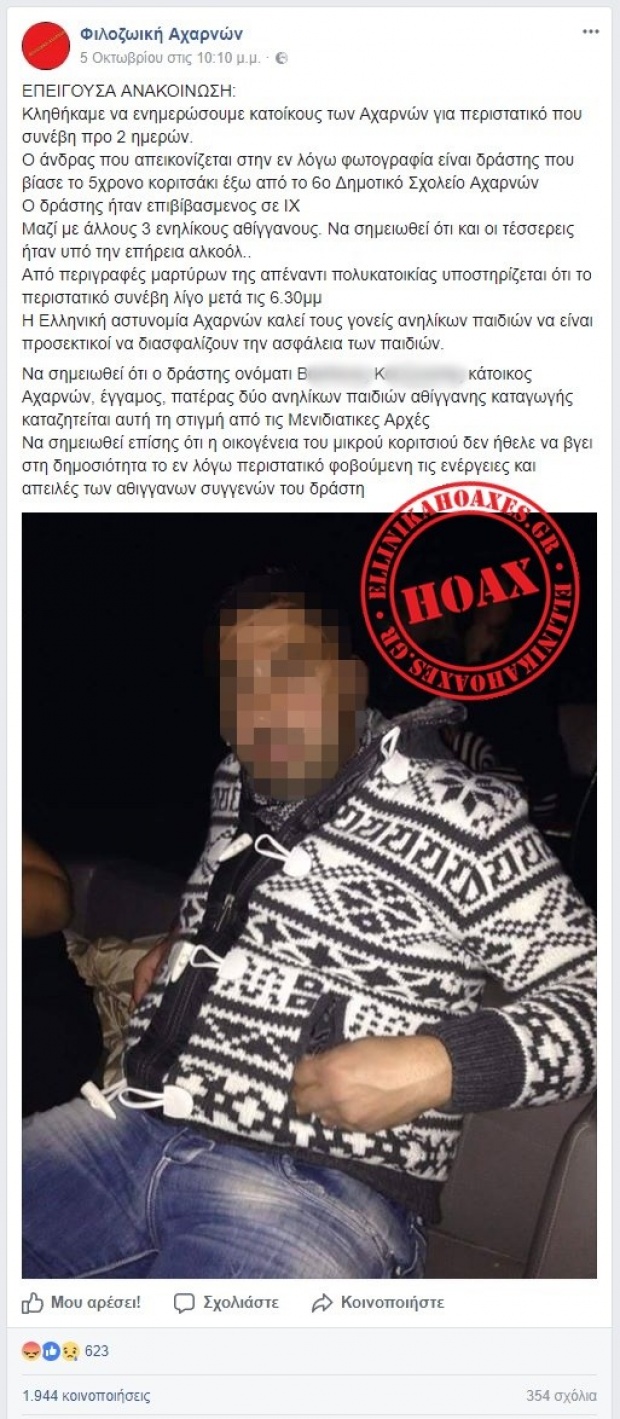 Η παραπάνω δημοσίευση περιέχει αρκετά στοιχεία που μας δείχνουν πως κάτι δεν πάει καλά. Πώς είναι δυνατόν, οι κάτοικοι της απέναντι πολυκατοικίας να παρακολουθούσαν και να μην επέμβουν; Ακόμη, αν παρατηρήσετε στο κείμενο της ανάρτησης, υπάρχουν λανθασμένες αναφορές όπως «Ελληνική αστυνομία Αχαρνών» και «Μενιδιατικες Αρχές».
