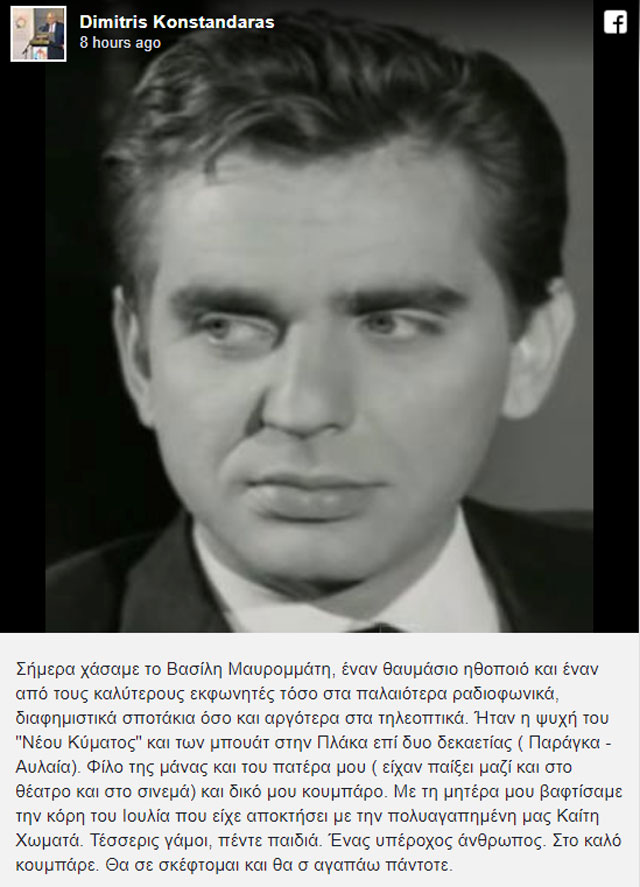 Την είδηση έκανε γνωστή μέσω του προφίλ του στο facebook ο δημοσιογράφος Δημήτρης Κωνσταντάρας, που όπως έγραψε ήταν κουμπάρος του καθώς μαζί με την μητέρα του είχαν βαφτίσει την κόρη του ηθοποιού με την Καίτη Χωματά.