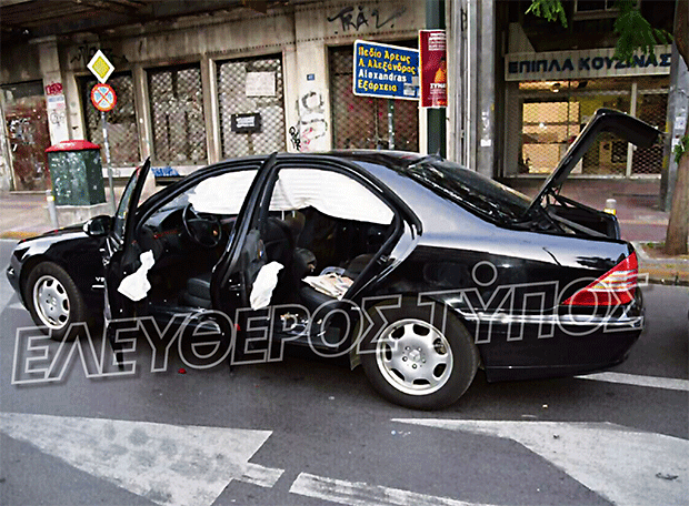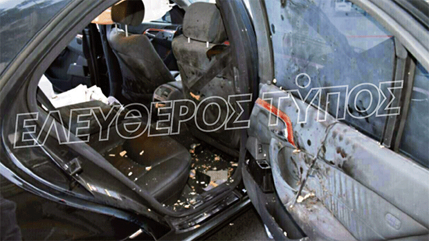 Εικόνες που παραπέμπουν σε βομβαρδισμένο τοπίο. Το αυτοκίνητο στο οποίο επέβαινε ο Λουκάς Παπαδήμος, όταν άνοιξε την παγιδευμένη επιστολή, μοιάζει σαν να βγήκε από εμπόλεμη ζώνη.