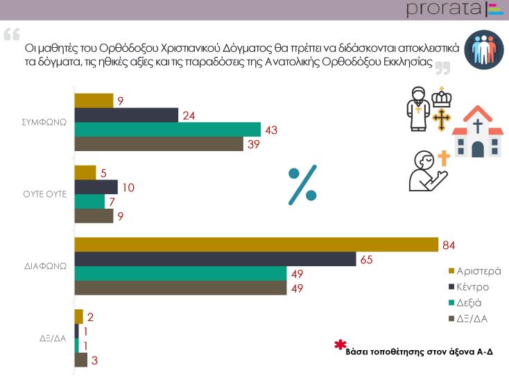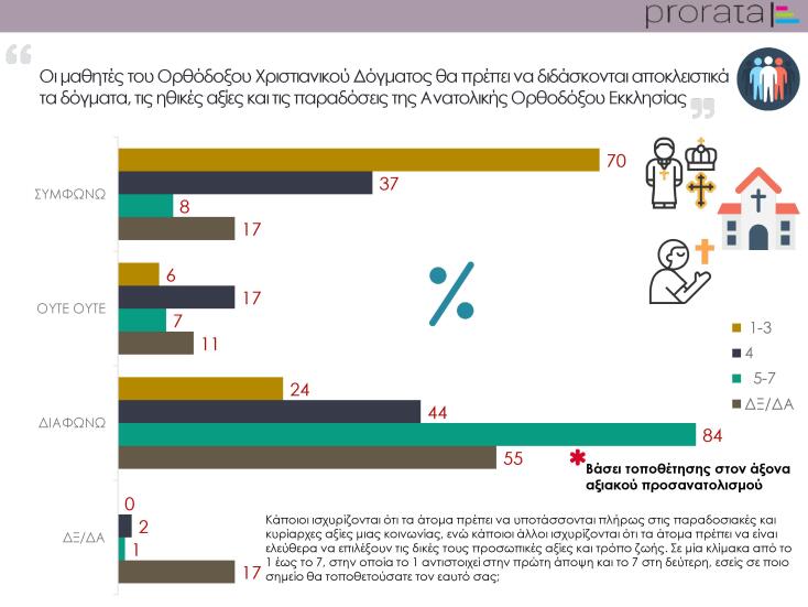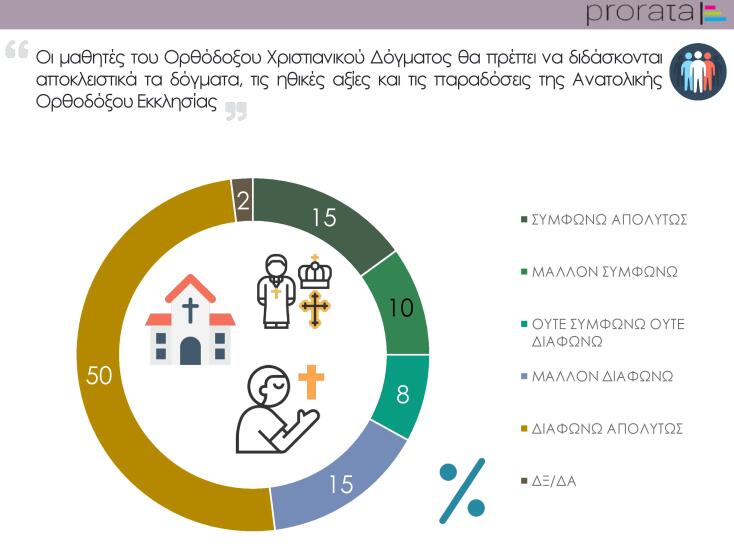 Με αφορμή την απόρριψη, την περασμένη εβδομάδα, από το Συμβούλιο της Επικρατείας της απόφασης του πρώην Υπουργού Παιδείας Νίκου Φίλη για τον τρόπο διδασκαλίας του μαθήματος των Θρησκευτικών στο Δημοτικό και στο Γυμνάσιο, η Prorata επιχείρησε να ανιχνεύσει τις τοποθετήσεις της κοινής γνώμης στο ερώτημα αν οι μαθητές του Ορθόδοξου Χριστιανικού Δόγματος θα πρέπει να διδάσκονται αποκλειστικά τα δόγματα, τις ηθικές αξίες και τις παραδόσεις της Ανατολικής Ορθόδοξης Εκκλησίας, χρησιμοποιώντας αυτολεξεί τη σχετική διατύπωση της Ολομέλειας του Συμβουλίου της Επικρατείας.