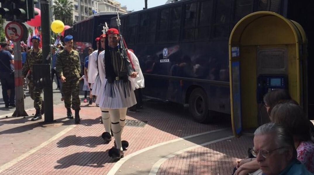 Να αλλάξουν πορεία αναγκάστηκαν οι Εύζωνες της προεδρικής φρουράς καθώς κλούβες των ΜΑΤ είχαν αποκόψει την πρόσβαση στην Ηρώδου Αττικού από την Βασιλίσσης Σοφίας λόγω των συγκεντρώσεων για την εργατική Πρωτομαγιά.