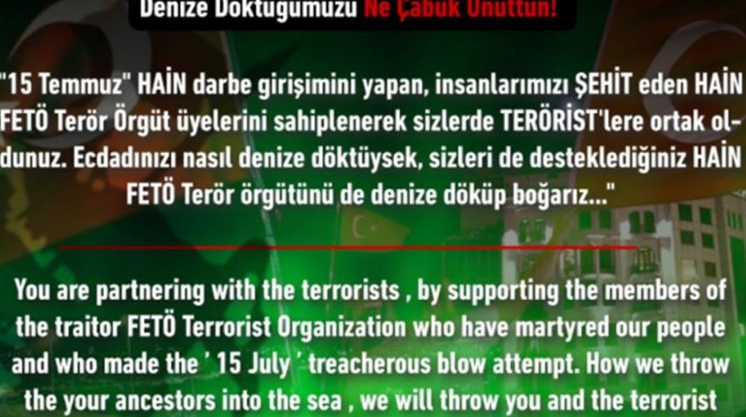 Σε αυτό υπήρχε αναφορά στην υπόθεση των οκτώ Τούρκων αξιωματικών που βρίσκονται στη χώρα μας και δεν έχουν εκδοθεί, αλλά και στον Φετουλάχ Γκιουλέν, τον οποίο ο Ταγίπ Ερντογάν θεωρεί ενορχηστρωτή της απόπειρας πραξικοπήματος της 15ης Ιουλίου του 2016. «Ελλάδα ξεχνάς γρήγορα, ρίξαμε στη θάλασσα τους προγόνους σας, θα το ξανακάνουμε» κατέληγε με απειλή το μήνυμα.
