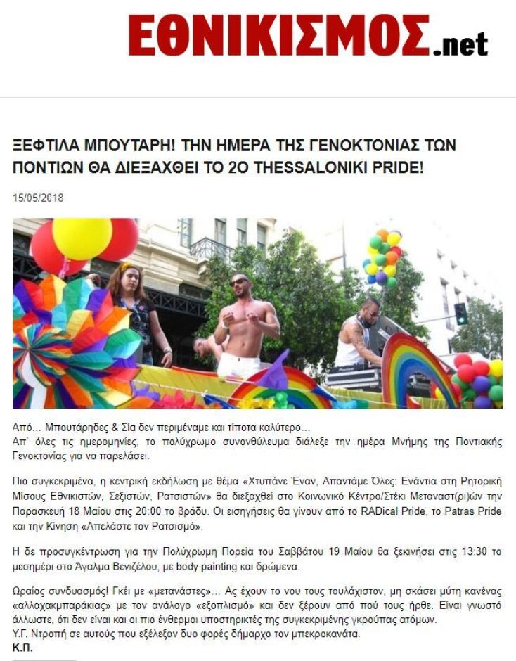 Σε αυτά τα δημοσιεύματα διαβάζουμε τον ισχυρισμό ότι ο Δήμαρχος έδωσε άδεια στο «2ο Αυτοοργανωμένο Thessaloniki Pride», και αφήνουν να εννοηθεί ότι αυτό έγινε επίτηδες για να αμαυρώσει την ημέρα μνήμης της γενοκτονίας.