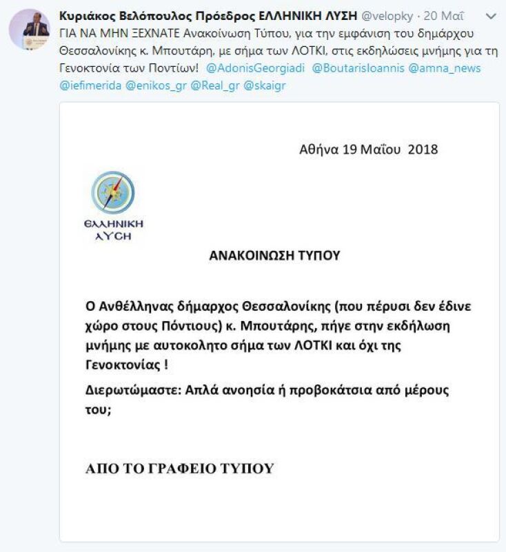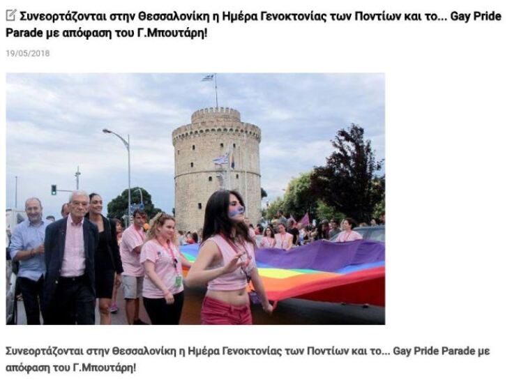Όμως το παραπάνω δεν του ήταν αρκετό. Ισχυρίστηκε ότι ο Μπουτάρης εμφανίστηκε στις εκδηλώσεις μνήμης για τη γενοκτονία των ποντίων με σήμα των ΛΟΤΚΙ.