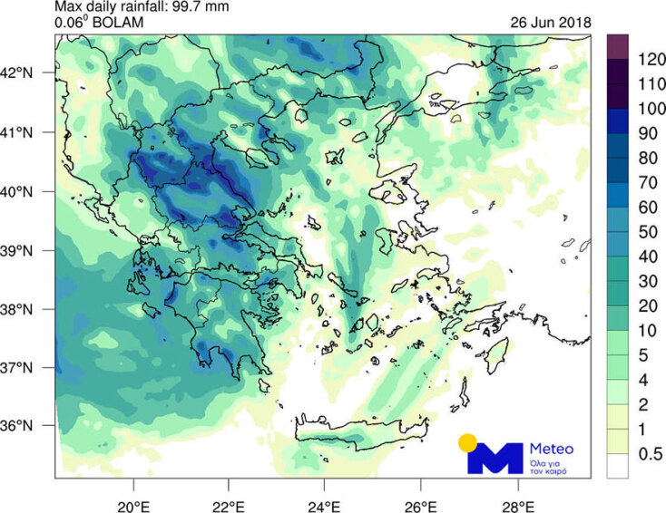 Δείτε τον χάρτη του meteo με τα ύψη βροχής που αναμένονται σήμερα: