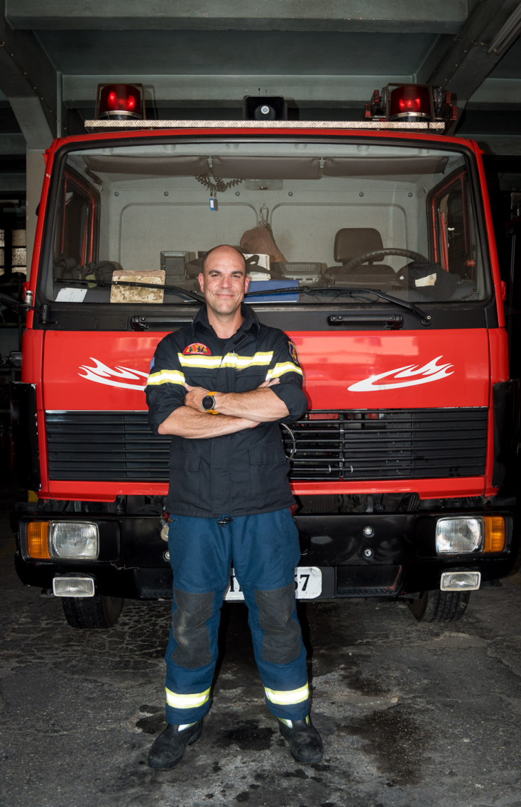 Φορώντας τη στολή εργασίας, ντυμένοι σαν αστακοί όπως λένε χαριτολογώντας μεταξύ τους, μας ξενάγησαν σε μερικά από τα μεγάλα κόκκινα φορτηγά τους: Στο «δίδυμο της φωτιάς», τα δύο οχήματα δηλαδή που βγαίνουν πρώτα σε περιστατικό πυρκαγιάς, στο «τράκερ», το βαρύ όχημα που χρησιμοποιούν για διασώσεις αλλά και στο όχημα διαδηλώσεων με το προστατευτικό κάλυμμα στο τζάμι του παρμπρίζ.