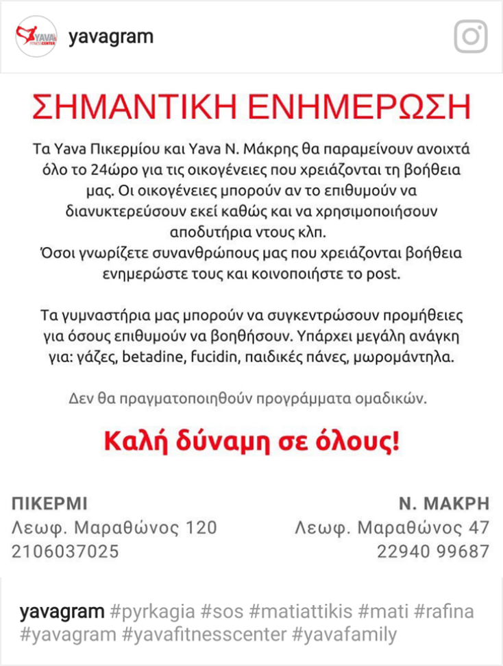 Τα γυμναστήρια YAVA Πικερμίου και Νέας Μάκρης ανακοίνωσαν ότι θα παραμείνουν ανοικτά όλο το 24ωρο, προκειμένου να εξυπηρετήσουν τις οικογένειες που χρειάζονται βοήθεια.