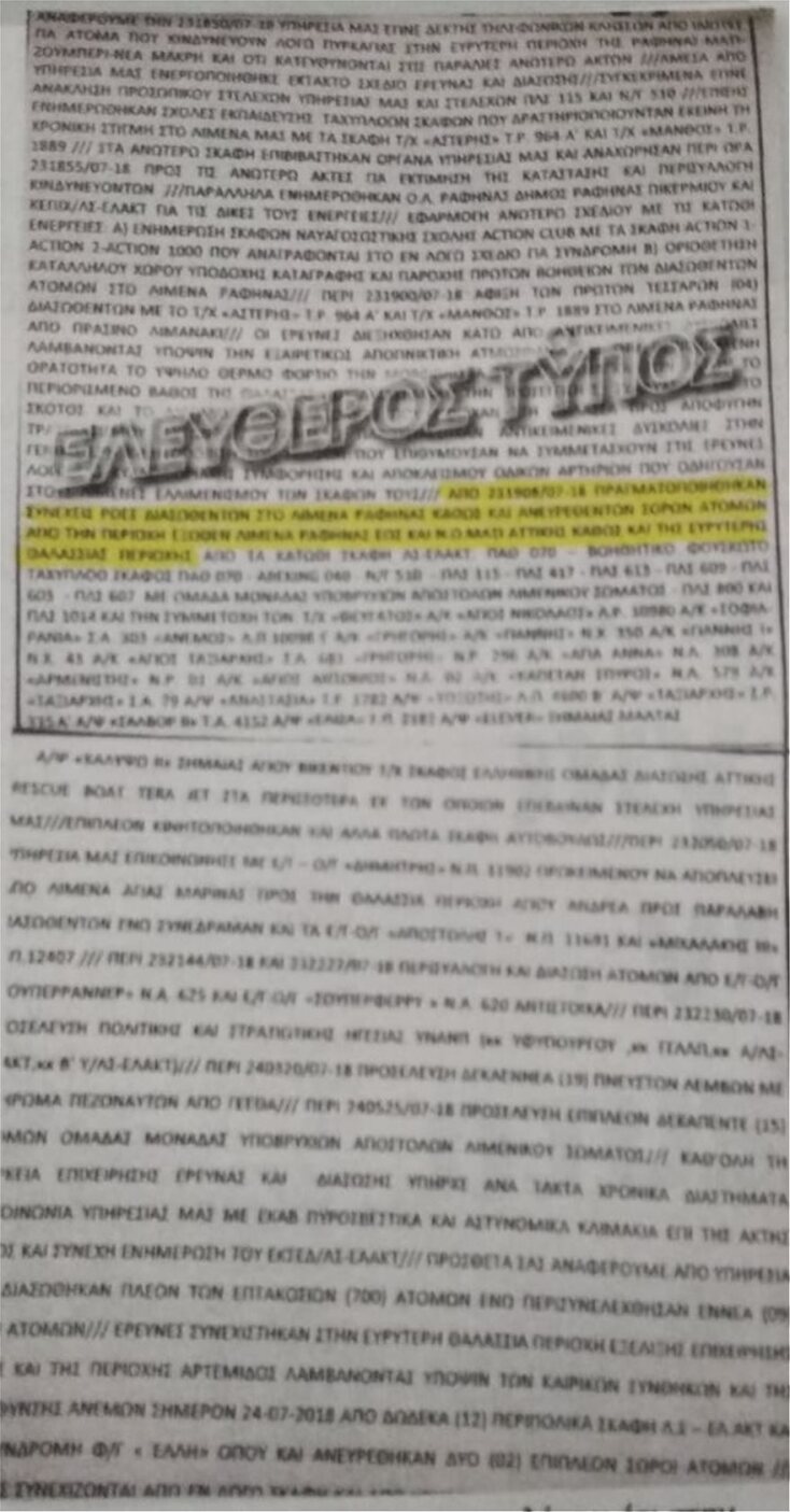 Το σήμα εστάλη στο Θάλαμο Επιχειρήσεων του Λιμενικού κι ενημέρωνε για τις συνεχείς ροές διασωθέντων στο λιμάνι της Ραφήνας, αλλά και την ανεύρεση σορών ατόμων από την περιοχή έξω από το λιμάνι ως το Μάτι και στην ευρύτερη περιοχή.
