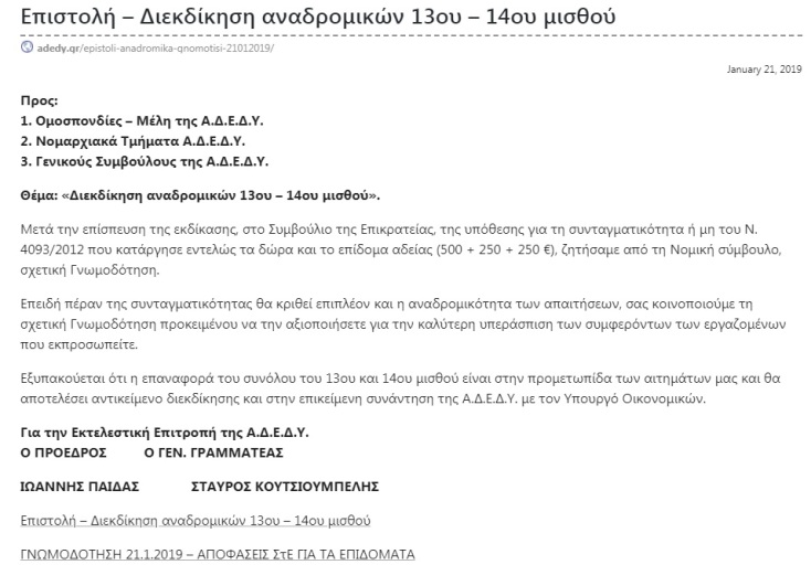 Η επιστολή Διεκδίκησης Αναδρομικών 13ου & 14ου μισθού: