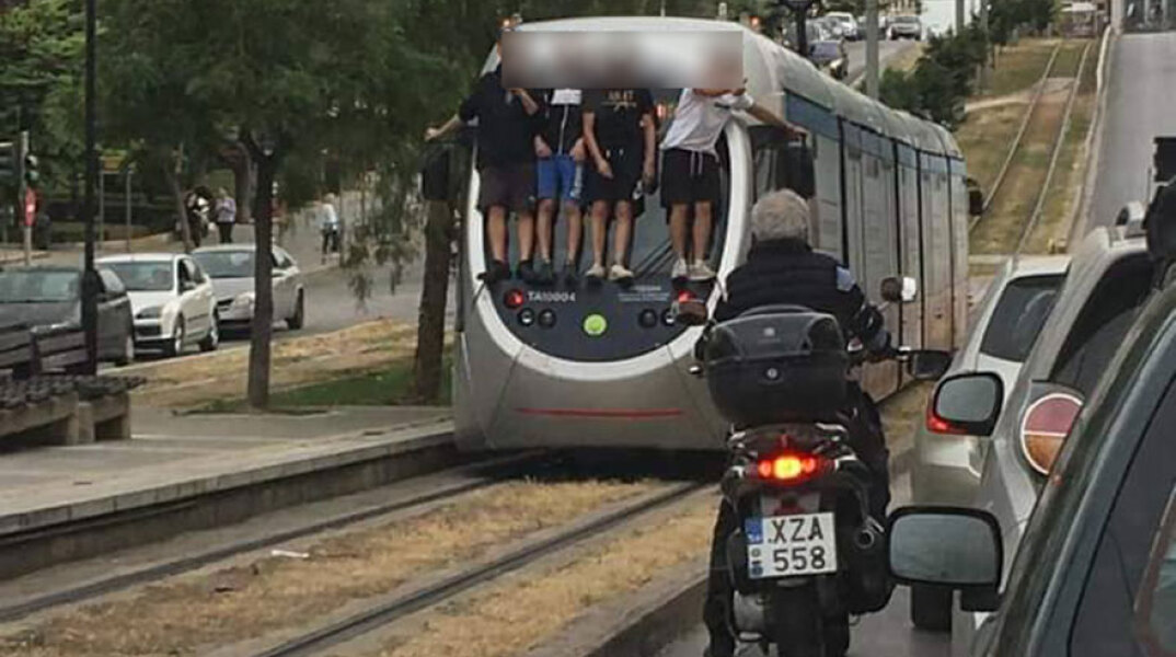 Σε φωτογραφία που ανέβηκε σε σελίδα στο Facebook φαίνονται 4 ανήλικοι να έχουν σκαρφαλώσει στο πίσω μέρος του Τραμ.