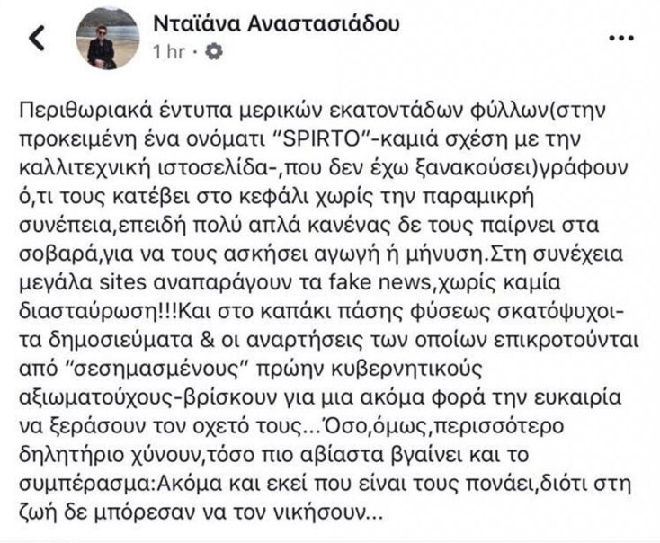 Από την πλευρά της η Νταιάνα Αναστασιάδου έγραψε στο Facebook: «Περιθωριακά έντυπα μερικών εκατοντάδων φύλλων «στην προκειμένη ένα ονόματι "SPIRTO"-καμία σχέση με την καλλιτεχνική ιστοσελίδα-, που δεν έχω ξανακούσει) γράφουν ό,τι τους κατέβει στο κεφάλι χωρίς την παραμικρή συνέπεια, επειδή πολύ απλά κανένας δεν τους παίρνει στα σοβαρά, για να τους ασκήσει αγωγή η μήνυση. Στη συνέχεια μεγάλα sites αναπαράγουν τα fake news, χωρίς καμία διασταύρωση!!! Και στο καπάκι πάσης φύσεως σκατόψυχοι τα δημοσιεύματα και οι αναρτήσεις των οποίων επικροτούνται από «σεσημασμένους» πρώην κυβερνητικούς αξιωματούχους-βρίσκουν για μια ακόμα φορά την ευκαιρία να ξεράσουν τον οχετό τους… Όσο, όμως, περισσότερο δηλητήριο χύνουν, τόσο πια αβίαστα βγαίνει και το συμπέρασμα: Ακόμα και εκεί που είναι τους πονάει, διότι στη ζωή δεν μπόρεσαν να τον νικήσουν…».