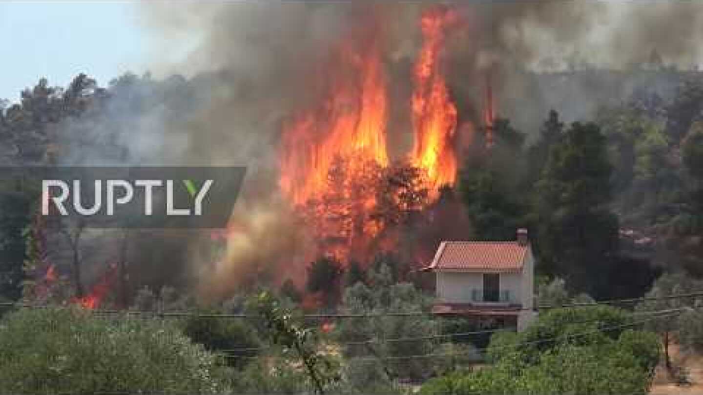Την ίδια στιγμή πυκνοί μαύροι καπνοί υψώνονται από το παρθένο πευκοδάσος κι έχουν καλύψει όλο τον ορίζοντα. Η φωτιά συνεχίζει να καίει, αν και σε απόσταση από το χωριό.