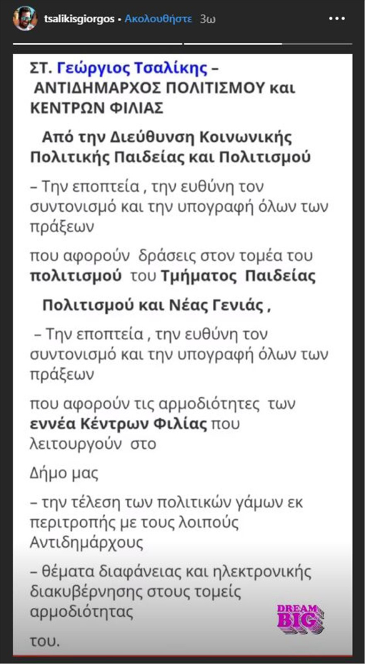 Καθήκοντα αντιδημάρχου Πολιτισμού και Κέντρων Φιλίας αναλαμβάνει ο Γιώργος Τσαλίκης στο Περιστέρι όπως ανακοίνωσε ο ίδιος μέσω Instagram.