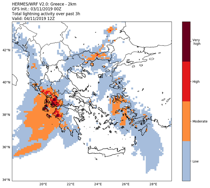 Εφαρμόζοντας κατάλληλο αλγόριθμο που αναπτύχτηκε στο Εθνικό Αστεροσκοπείο Αθηνών και βασίζεται στο περιοχικό προγνωστικό μοντέλο WRF είμαστε σε θέση να εκτιμήσουμε και την ένταση των ηλεκτρικών φαινομένων στη ατμόσφαιρα (κεραυνοί) κατά τη διάρκεια καταιγίδων. Παράδειγμα αποτελεί ο σχετικός χάρτης που παρουσιάζει την ισχύ της ηλεκτρικής δραστηριότητας το μεσημέρι της Δευτέρας 4/11 με την εντονότερη δραστηριότητα να αναμένεται στο Ιόνιο και στα δυτικά ηπειρωτικά.