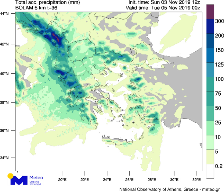 Με τη χρήση περιοχικών προγνωστικών μοντέλων υψηλής ανάλυσης, είμαστε σε θέση να προβλέψουμε με αυξημένη ακρίβεια και λεπτομέρεια τις περιοχές που θα επηρεαστούν περισσότερο. Στον χάρτη που ακολουθεί φαίνεται η κατανομή του ολικού υετού έως το βράδυ της Δευτέρας 4/11, όπως προβλέπεται από το μοντέλο Bolam. Όπως προκύπτει τα μεγαλύτερα ύψη βροχής αναμένονται στα δυτικά ηπειρωτικά, το Ιόνιο, τη Θράκη και την Ανατολική Μακεδονία.