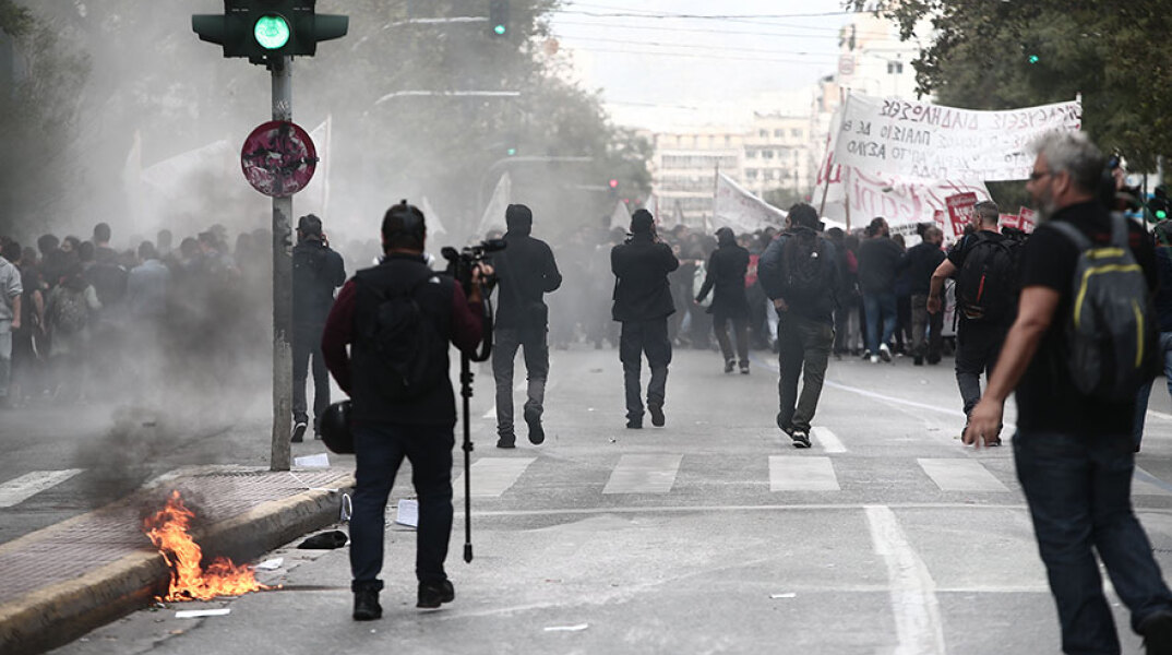 Ένταση στη μαθητική πορεία στο κέντρο της Αθήνας. Άγνωστοι έριξαν πέτρες και βόμβες μολότοφ εναντίον των αστυνομικών.