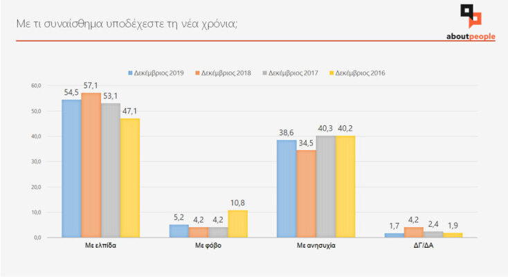 Το 54,5% δηλώνει ότι υποδέχεται το 2020 με αισιοδοξία, το 38,6% με ανησυχία και το 5,2% με φόβο.
