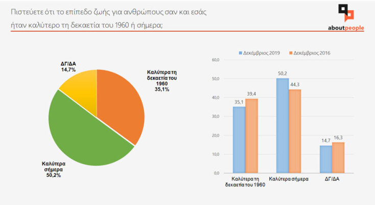 Το 50,2% θεωρεί ότι το επίπεδο ζωής είναι καλύτερο σήμερα σε σχέση με τη δεκαετία του '60, ενώ το 35,1% θεωρεί το αντίθετο.