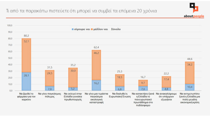 Το 80,1% θεωρεί πιθανό να βρεθεί το φάρμακο για τον καρκίνο, το 31,5% να γίνει παγκόσμιος πόλεμος, το 35,2% να εκλεγεί στην Ελλάδα γυναίκα πρωθυπουργός, το 62,4% να γίνει μια τεράστια παγκόσμια οικολογική καταστροφή, το 16,7% να κατακτήσει ξανά η χώρα μας το ευρωπαϊκό πρωτάθλημα στο ποδόσφαιρο, το 22,4% να ανακαλύψουμε ότι υπάρχουν εξωγήινοι και το 44,6% να αντιμετωπίσει ξανά η Ελλάδα μια πολύ μεγάλη οικονομική κρίση.