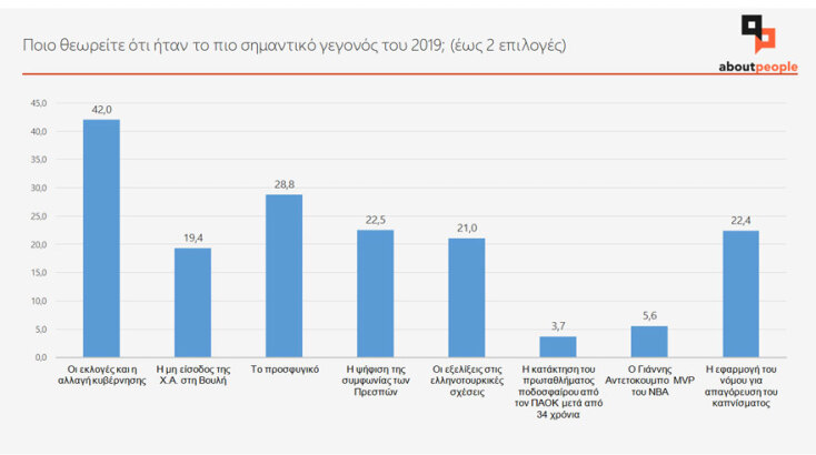 Έρευνα για τη νέα χρονιά την οποία πραγματοποιεί κάθε Δεκέμβριο η aboutpeople, παρουσιάζει σήμερα η ATHENS VOICE και τα ευρήματά της είναι πράγματι εντυπωσιακά. Ως σημαντικότερο γεγονός για τη χρονιά που τελειώνει κρίνονται οι εκλογές και η αλλαγή κυβέρνησης με 42%, ενώ έπεται το προσφυγικό με 28,8%. Ακολουθούν η ψήφιση της συμφωνιας των Πρεσπών (22,5%), η εφαρμογή του νόμου για την απαγόρευση του καπνίσματος (22,4%) και οι εξελίξεις στις ελληνοτουρκικές σχέσεις (21%).