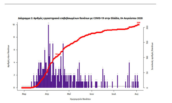 » Τέλος, δεν έχει καταγραφεί κανένας νέος θάνατος ενώ έχουμε 209 θανάτους συνολικά στη χώρα. 67 (32,1%) γυναίκες και οι υπόλοιποι άνδρες. Η διάμεση ηλικία των θανόντων συμπολιτών μας ήταν τα 76 έτη και το 95,7% είχε κάποιο υποκείμενο νόσημα ή/και ηλικία 70 ετών και άνω».