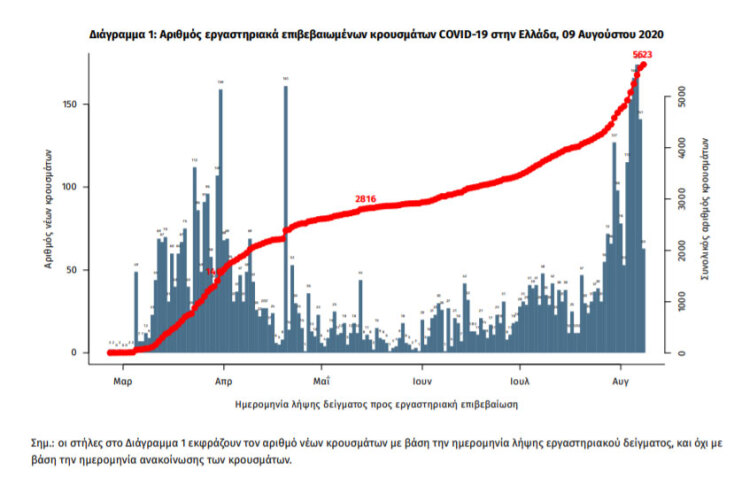 Τα συνολικά επιβεβαιωμένα κρούσματα κορωνοϊού αυξήθηκαν σε 5.623, εκ των οποίων το 54,8% είναι άνδρες. Από τα 203 νέα κρούσματα κορωνοϊού στην Ελλάδα που ανακοινώθηκαν από τον ΕΟΔΥ την Κυριακή 9 Αυγούστου 2020, μόλις τα 29 εντοπίστηκαν κατόπιν ελέγχων σε πύλες εισόδου της χώρας.