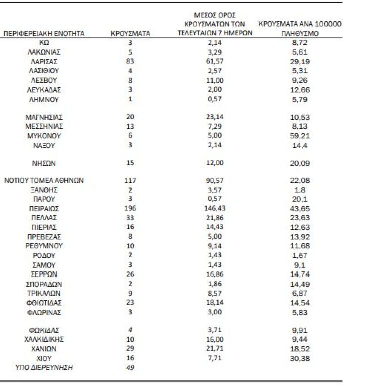 Αναλυτικά τα κρούσματα ανά Περιφερειακή Ενότητα: