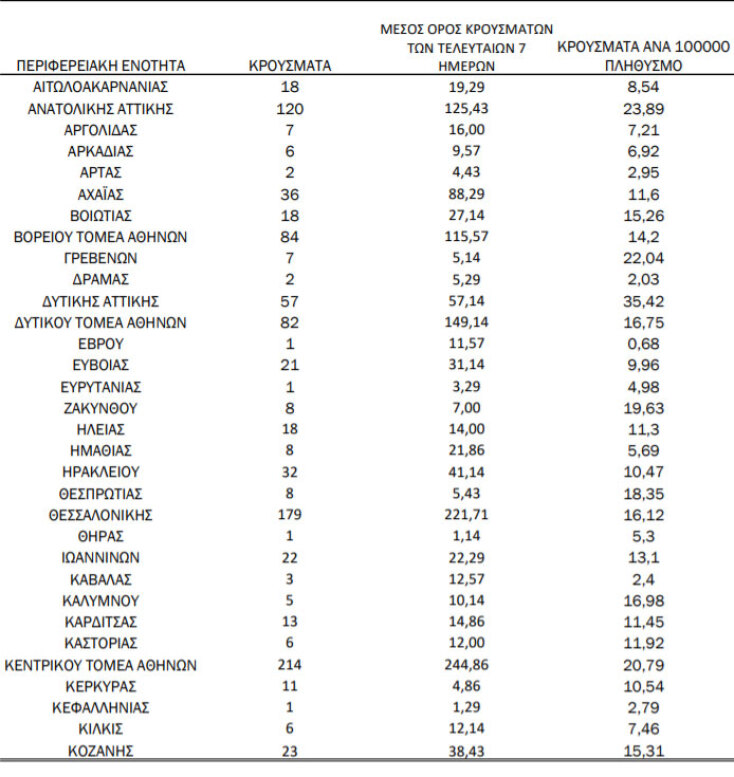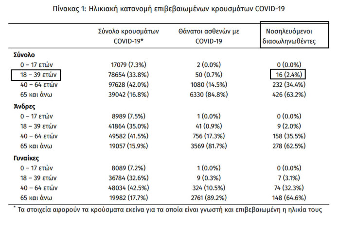 » Ο μέσος όρος εισαγωγών του επταημέρου είναι 481 ασθενείς. Η διάμεση ηλικία των κρουσμάτων είναι 44 έτη (εύρος 0.2 έως 105 έτη), ενώ η διάμεση ηλικία των θανόντων είναι 79 έτη (εύρος 0 έως 103 έτη)».