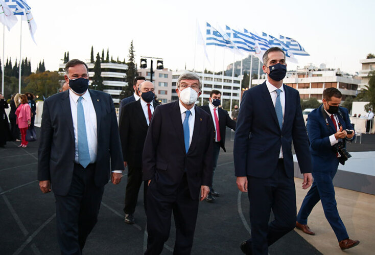 Στην εκδήλωση για τη φωταγώγηση του μνημείου ήταν ο πρόεδρος της Διεθνούς Ολυμπιακής Επιτροπής, Τόμας Μπαχ ο οποίος βρίσκεται στην Ελλάδα.