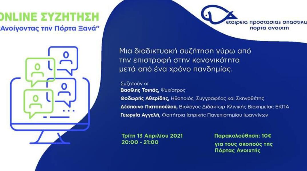 Τη διαδικτυακή αυτή εκδήλωση διοργανώνει η Εταιρεία Προστασίας Σπαστικών/ Πόρτα Ανοιχτή την Τρίτη 13/4, 8-9μμ. Τα έσοδα θα διατεθούν στο Πρότυπο Κέντρο Πόρτα Ανοιχτή στο οποίο παρέχεται καθημερινά ένα ευρύ φάσμα προγραμμάτων εκπαίδευσης, αποκατάστασης, αθλητισμού και ψυχαγωγίας σε 240 παιδιά και ενήλικες με εγκεφαλική παράλυση