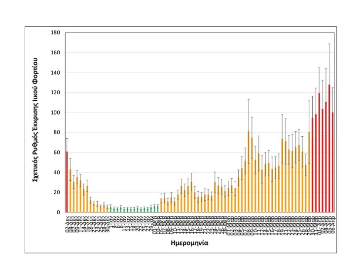 Το ιικό φορτίο, όπως φαίνεται στα διαγράμματα που παρουσιάζει το ΑΠΕ-ΜΠΕ, ανιχνεύεται σε πολύ υψηλές τιμές, αντίστοιχες του πρώτου δεκαημέρου του Νοεμβρίου.