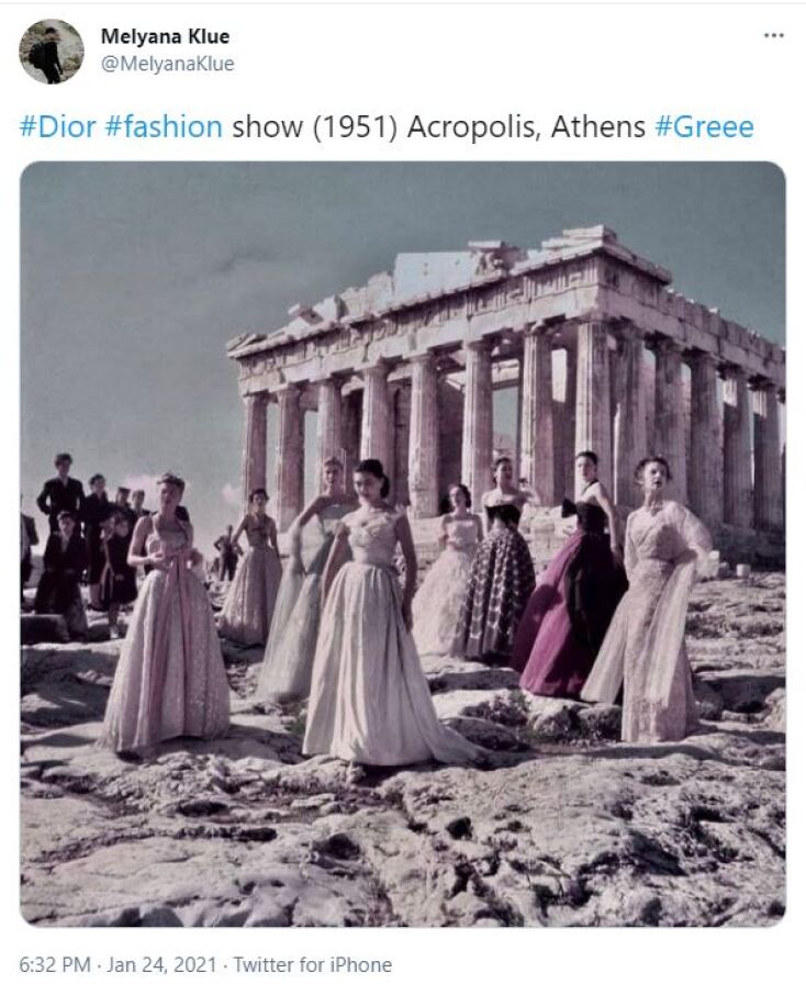 To 1951, ο Κριστιάν Ντιόρ (Christian Dior) φωτογράφιζε τις δημιουργίες του στον βράχο της Ακρόπολης. Οκτώ μοντέλα με φορέματα γλυπτά, με αυστηρότητα στη ραφή, αλλά και με αισθησιaκή θηλυκότητα, στάθηκαν στο βράχο της Ακρόπολης.