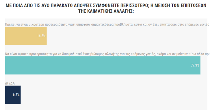 Η μείωση των επιπτώσεων της κλιματικής αλλαγής πρέπει να είναι ύψιστη προτεραιότητα για να διασφαλίσουμε ένα βιώσιμο πλανήτη για τις επόμενες γενιές ακόμα και αν πρέπει να μείνουν πίσω άλλα σημαντικά προβλήματα που αντιμετωπίζει ο κόσμος σήμερα, είπε το 77,3%, ενώ το 16,5% υποστηρίζει ότι πρέπει να είναι μικρότερη προτεραιότητα στην παρούσα φάση γιατί αντιμετωπίζουμε πολύ σημαντικότερα προβλήματα ακόμα και αν αυτό μπορεί να έχει επιπτώσεις στις επόμενες γενιές.