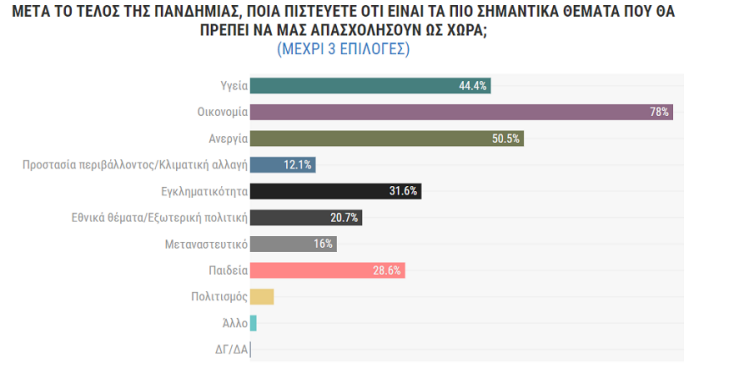 Παράλληλα όμως, μόνο περίπου ένας στους δέκα θεωρεί ότι θα πρέπει να αποτελέσει την πρώτη προτεραιότητα μετά το τέλος της πανδημίας. Έτσι, το 12,1% συγκεντρώνει η προστασία του περιβάλλοντος/κλιματική αλλαγή στην ερώτηση «μετά το τέλος της πανδημίας του κορονοϊού, ποια πιστεύετε ότι είναι πιο σημαντικά θέματα που θα πρέπει να μας απασχολήσουν ως χώρα».