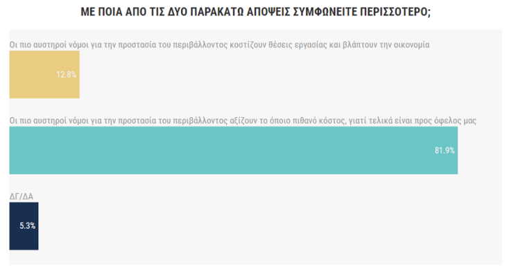 Το 81,9% πιστεύει ότι οι πιο αυστηροί νόμοι για την προστασία του περιβάλλοντος αξίζουν το όποιο πιθανό κόστος γιατί τελικά είναι προς όφελός μας, ενώ το 12,8% ότι οι πιο αυστηροί νόμοι για την προστασία του περιβάλλοντος κοστίζουν θέσεις εργασίας και βλάπτουν την οικονομία.