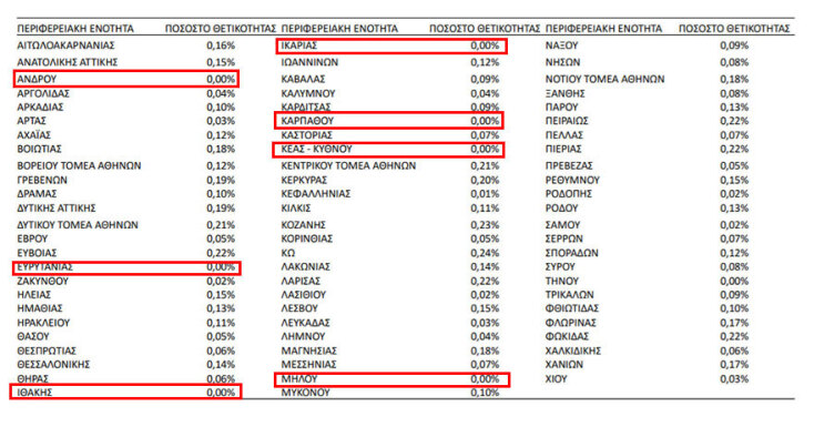 Όπως φαίνεται και στον πίνακα του ΕΟΔΥ, Άνδρος, Ευρυτανία, Ιθάκη, Ικαρία, Κέα - Κύθνος, Κάρπαθος και Μήλος είναι «covid-free» περιοχές, καθώς ο δείκτης θετικότητας διαμορφώνεται στο 0%.